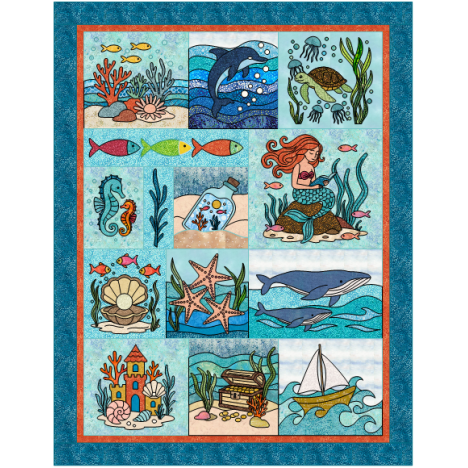 This whimsical ocean-themed applique quilt features a collection of playful underwater scenes, including sea creatures, waves, coral, hidden treasures, and a gentle mermaid. The overall look is cheerful, calm, and story-driven, making it ideal for a child’s bedroom, playroom, or nursery.