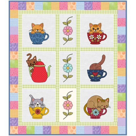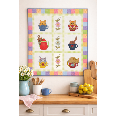This whimsical applique quilt features playful kittens peeking out of teacups, balanced with simple floral blocks in a clean, easy-to-follow layout. The bold applique shapes are clear and satisfying to sew, making the project approachable while still engaging. It’s a fun, low-pressure quilt that lets you enjoy finishing one charming block at a time, over a six-month period, with a cheerful result that works beautifully as a decorative accent or gift.